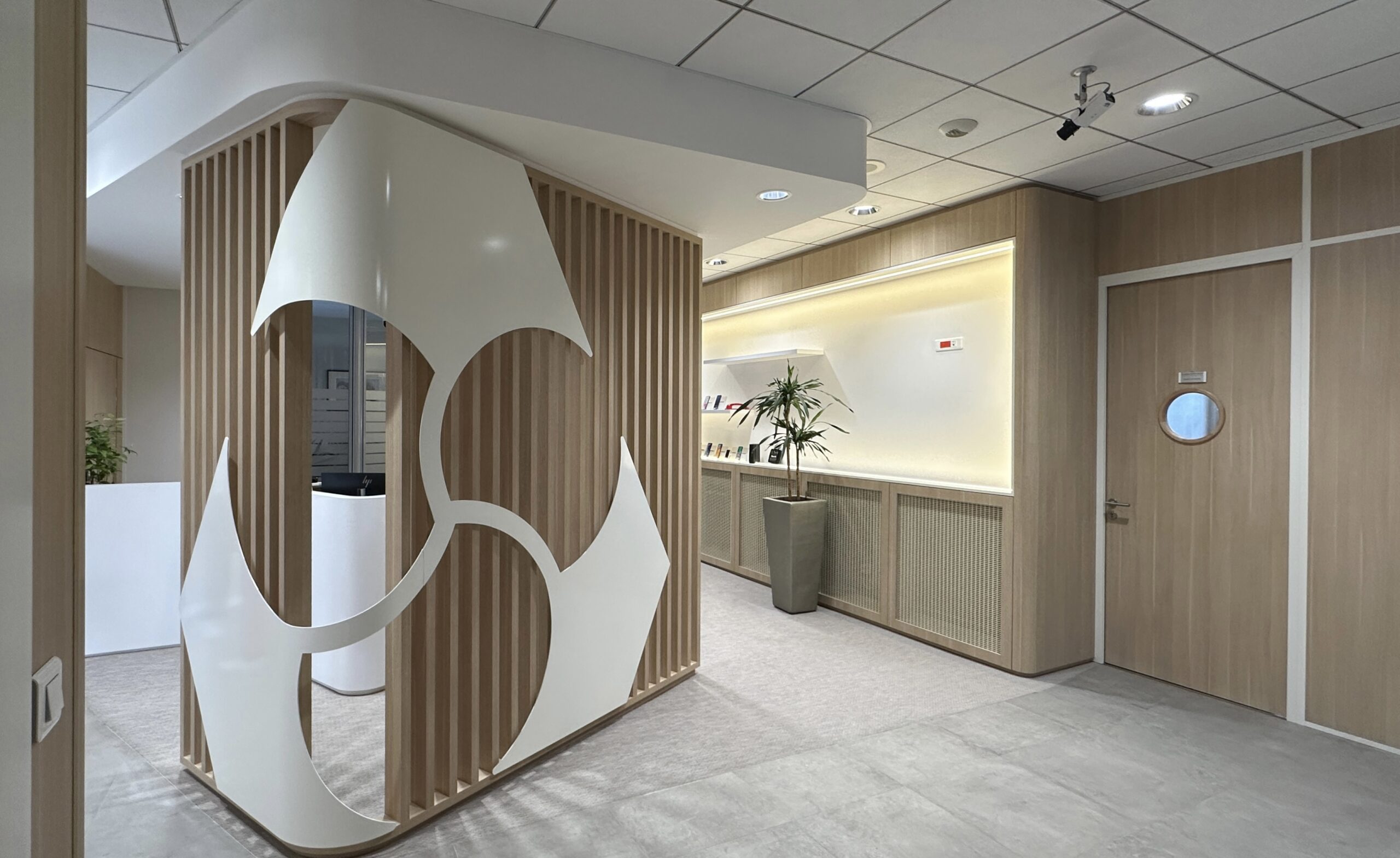 Le claustra soutenant le logo cintré définit les espaces de circulation, et permet également de suggérer un espace de discrétion, en laissant ouvert le regard sur le reste de l’agence.